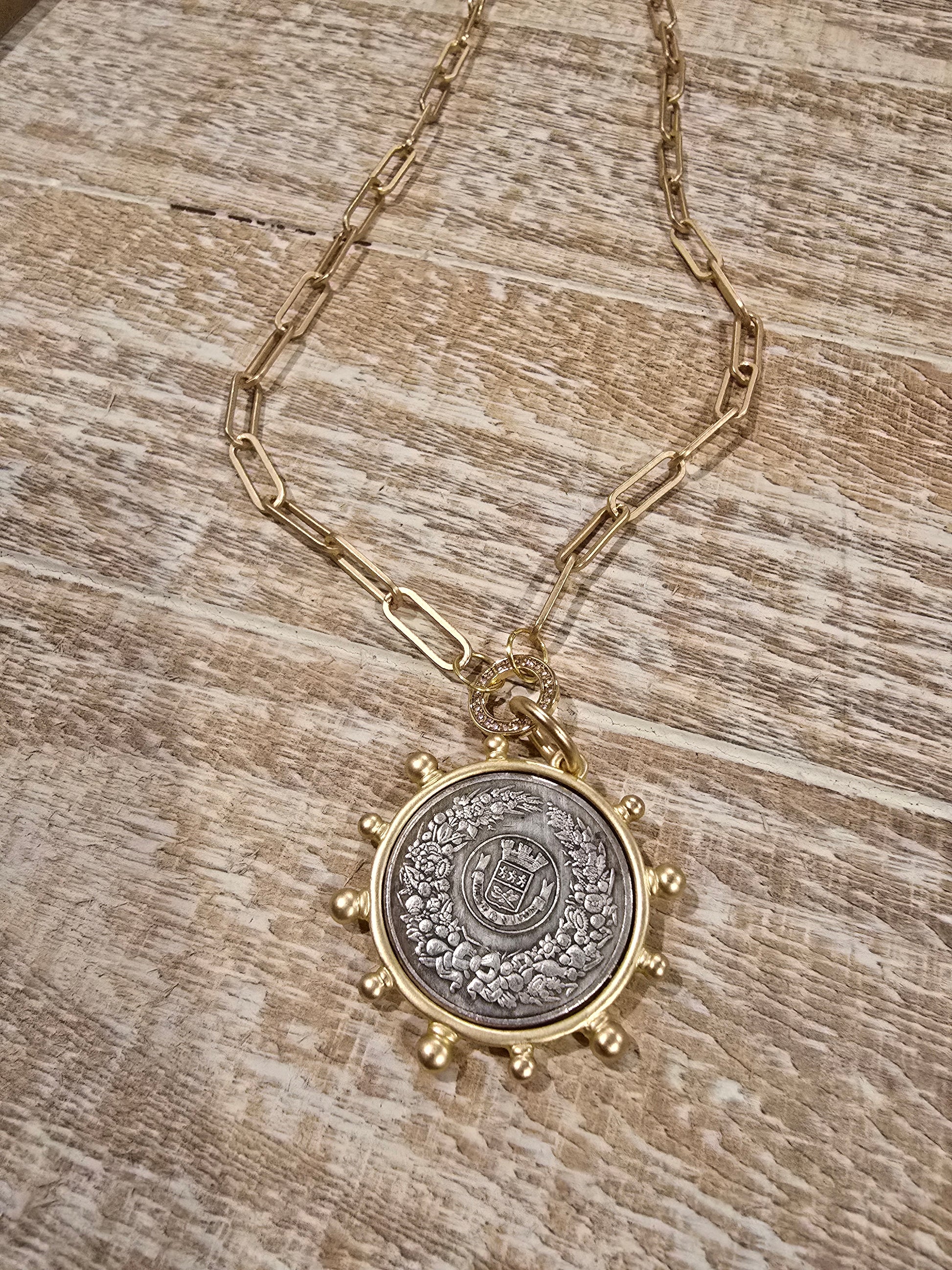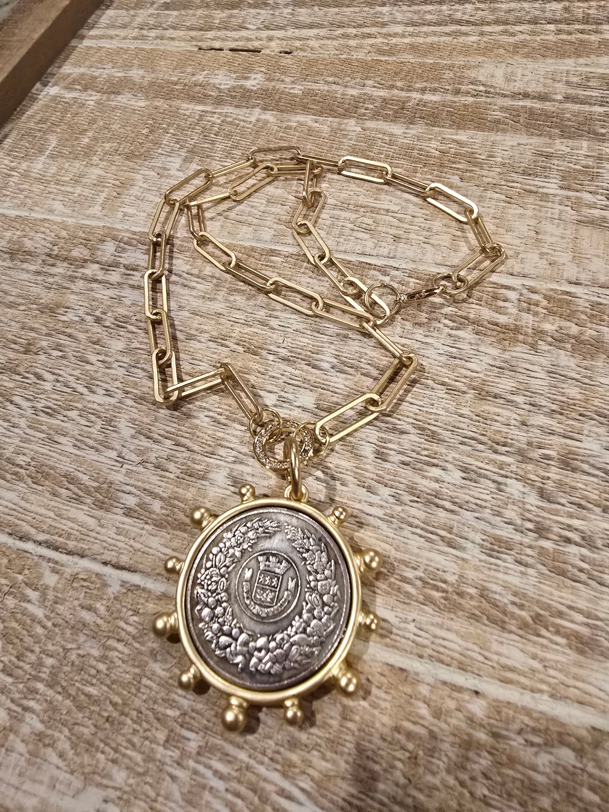 Vintage-Inspired French Coin Pendant Necklace | Gold Paperclip Chain
